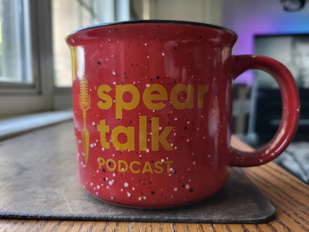 Here is the new Spear Talk Campfire mug in a brand new speckled red and gold color-way. All previous mug designs have SOLD OUT, so here we are coming back with a new color scheme… SIP THE TRUTH!